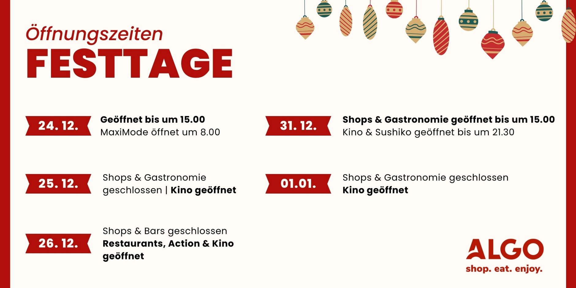 Die bisher 10 Geschäfte im Maxi Mode Center Algund wurden um 30 Shops und Restaurants erweitert. Mit 40 Geschäften zählt ALGO zu den größten Einkaufszentren in Südtirol. Eine Mischung aus lokalen Anbietern und internationalen Marken versprechen ein abwechslungsreiches und vielseitiges Shoppingvergnügung für Jung und Alt.